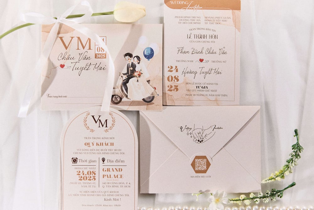 Điểm nhấn: Nhiều cặp đôi tại Huế hiện nay còn ưa chuộng việc vẽ minh họa hình ảnh cô dâu chú rể hoặc địa điểm kỷ niệm lên thiệp, tạo sự độc bản và khiến khách mời muốn lưu giữ làm kỷ niệm.
