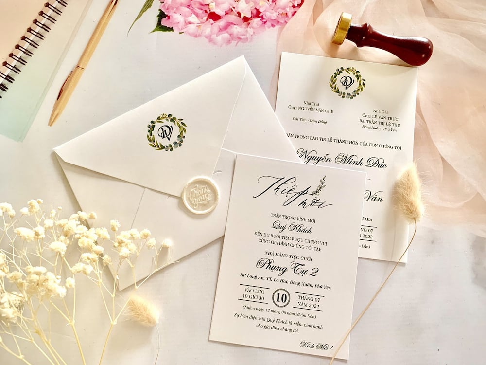 Điểm nhấn: Kết hợp với phụ kiện như dây sáp seal (tem sáp) hoặc nơ ruy băng lụa tạo chiều sâu và sự cao cấp cho bộ thiệp.