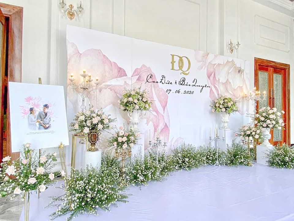 Backdrop không nhất thiết phải cầu kỳ với quá nhiều phụ kiện. Lựa chọn phong cách tối giản, tinh tế giúp giảm chi phí vật liệu, nhân công mà vẫn giữ được nét thẩm mỹ sang trọng.