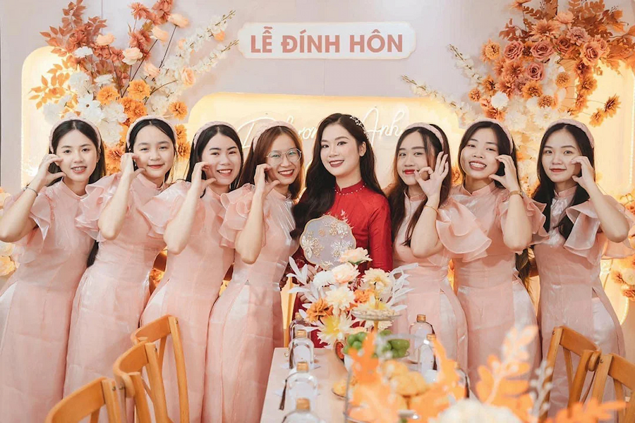 Sự đồng bộ: Áo dài cô dâu nên có sự kết nối với áo dài chú rể và nổi bật hơn so với dàn bê quả (thường chọn màu pastel nhạt) để đội hình lên hình hài hòa nhất.