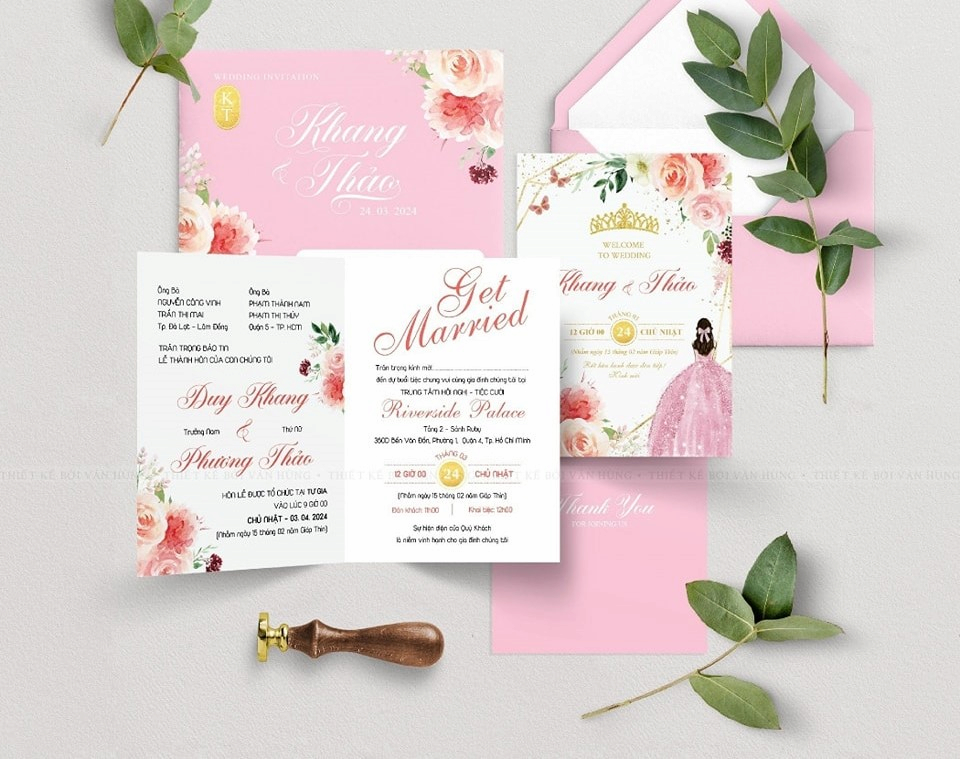 Mẹo nhỏ: Khi chọn mẫu thiệp cưới, bạn nên dựa vào chủ đề tiệc cưới, tông màu trang trí và cá tính của hai bạn để tạo nên sự đồng điệu và ấn tượng ngay từ lời mời đầu tiên.