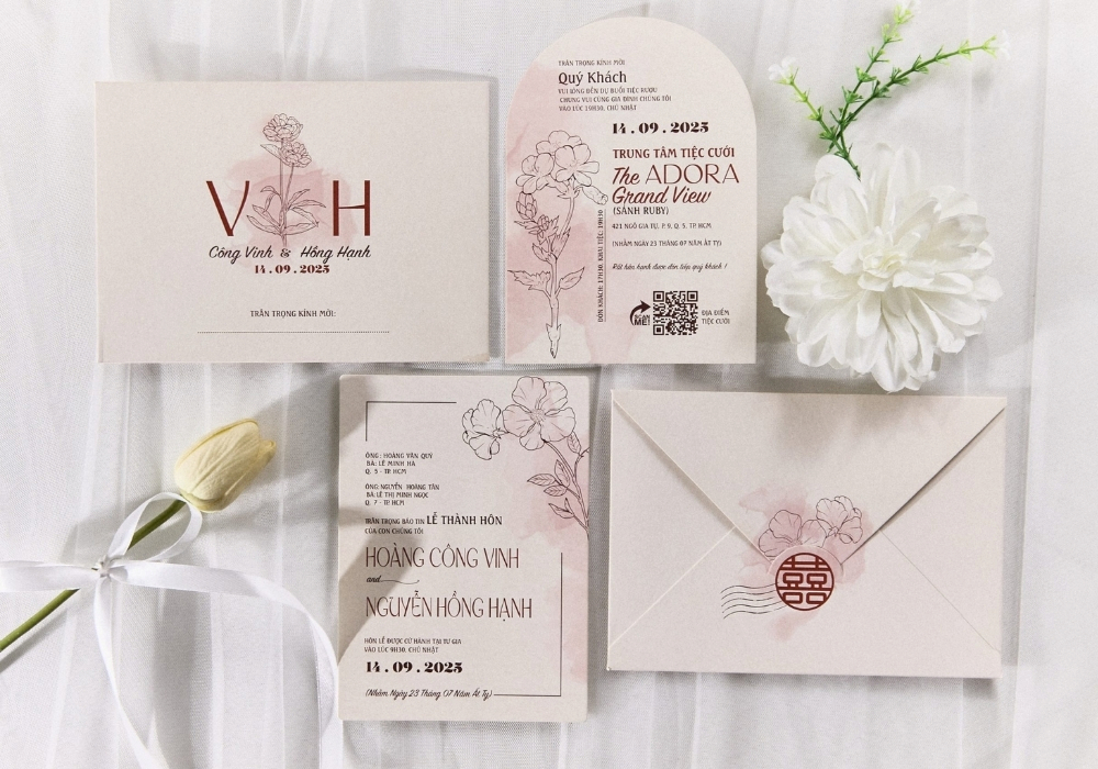 Từ thiết kế – in ấn – bao thư – tem dán – phụ kiện đi kèm, tất cả được thực hiện đồng bộ, giúp cô dâu chú rể tiết kiệm thời gian và chi phí mà vẫn có thiệp cưới hoàn hảo như ý.