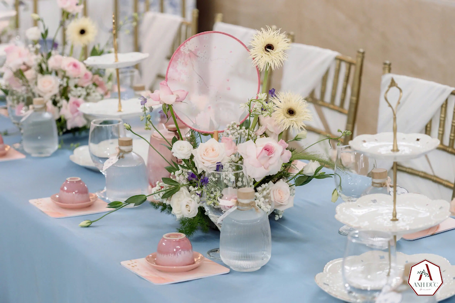TRANG TRÍ TIỆC CƯỚI TONE XANH + HỒNG PASTEL