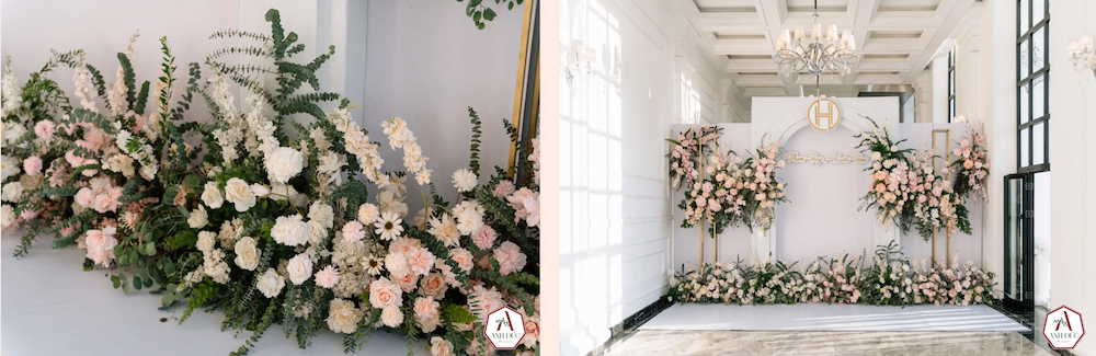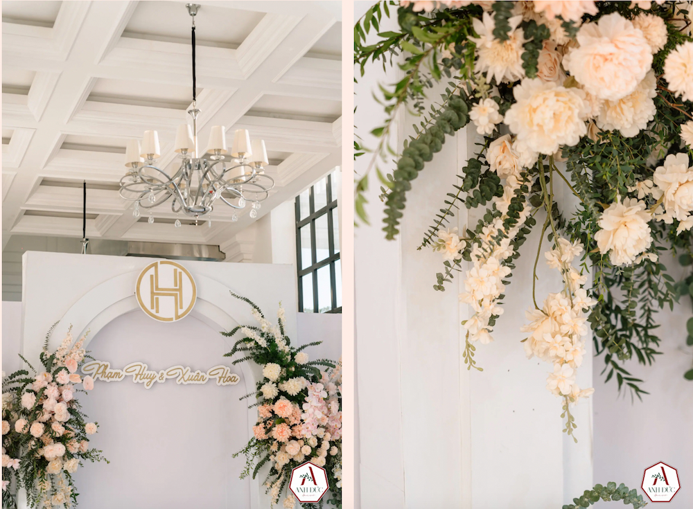 Với hoa lụa tinh tế, lá tươi xanh mát và tông trắng thanh lịch, không gian cưới được biến hóa thành bức tường thành lộng lẫy như trong giấc mơ cổ tích.