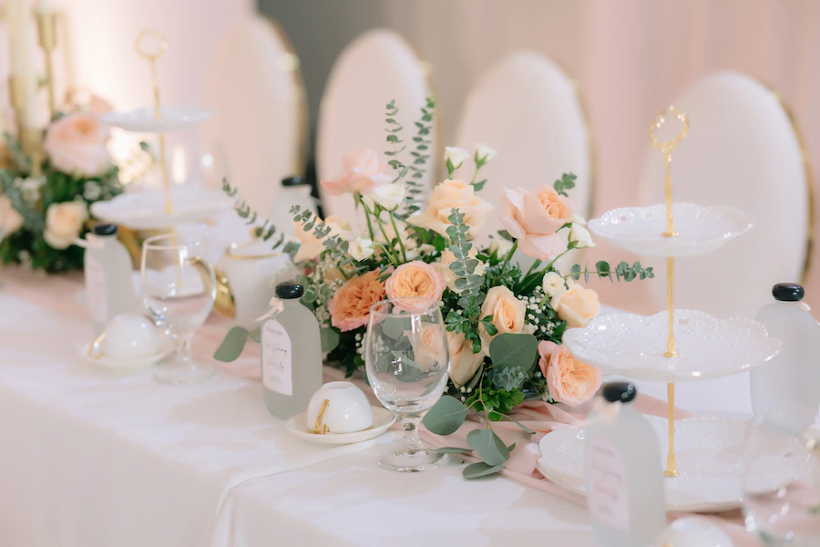 Với gam màu vàng nắng kết hợp hồng kem nhẹ nhàng trên nền lá xanh, Anh Đức Wedding đã tạo nên một không gian huyền ảo trong ánh nắng nhẹ nhàng lung linh của một sớm ngày đầu thu đúng với sở thích của cô dâu Ánh Dương.