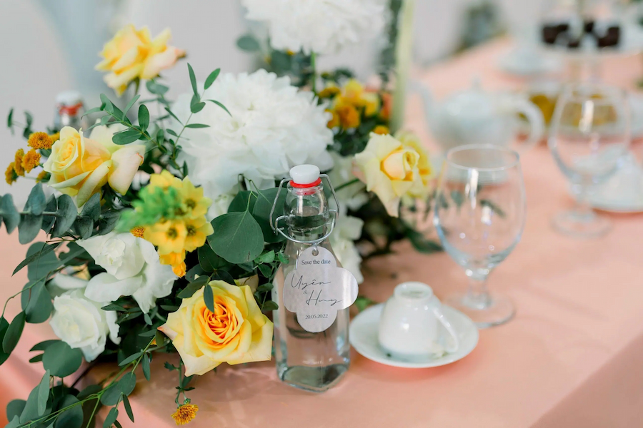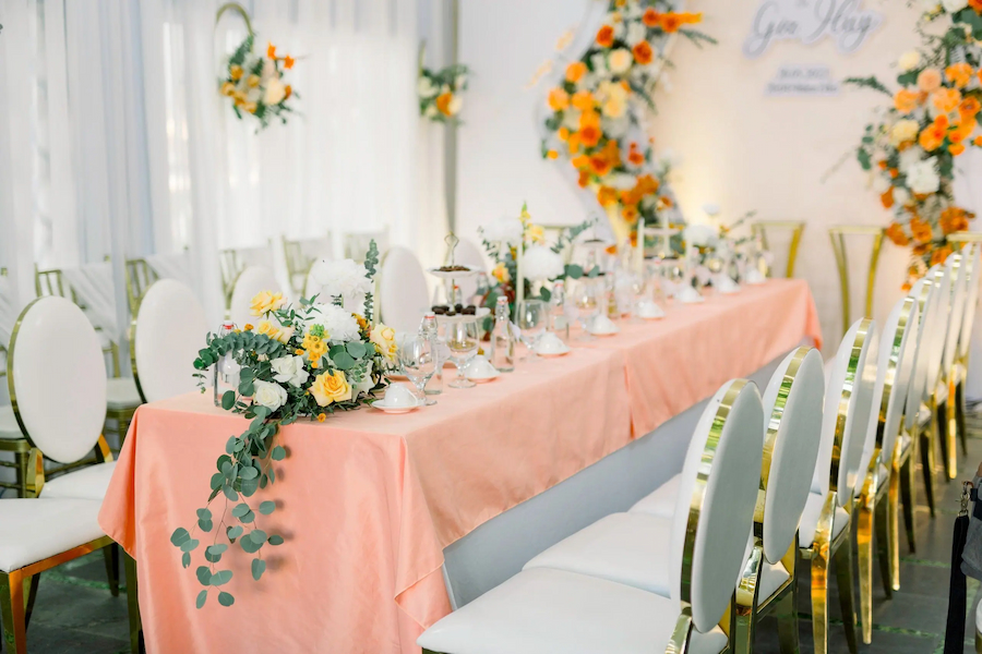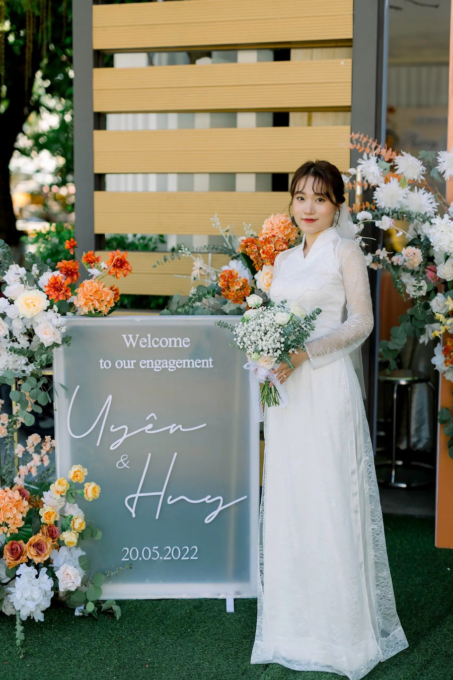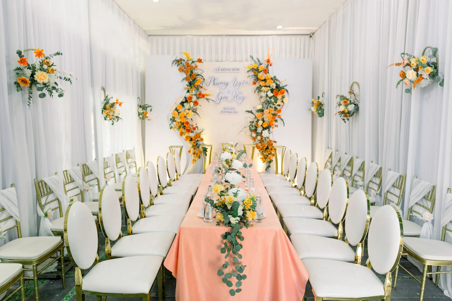 Không gian đính ước của cặp dâu rể Phương Uyên & Gia Huy được biến hóa theo concept mùa hè rực rỡ và lãng mạn. Cảm hứng đến từ buổi hoàng hôn mùa hè rực cháy ánh vàng cam.