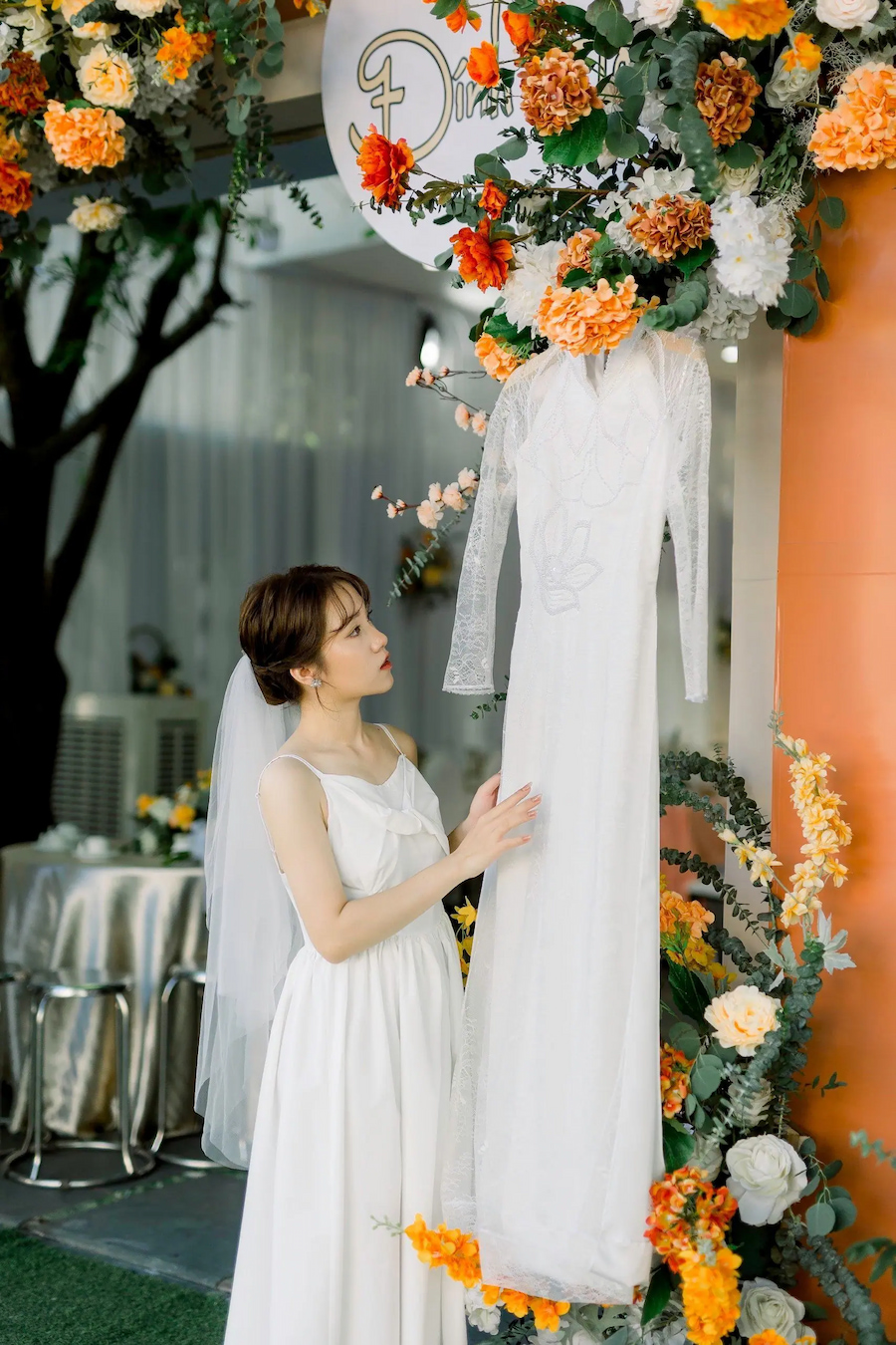 Không gian cưới cực kỳ tinh tế, hài hòa và trang nhã. Những khóm hoa lụa ôm trọn không gian ngày trọng đại. Sắc trắng và xanh lá được kết hợp, biến không gian vàng cam tưởng chừng cháy bỏng hóa mềm mại mà tinh khôi lạ thường.