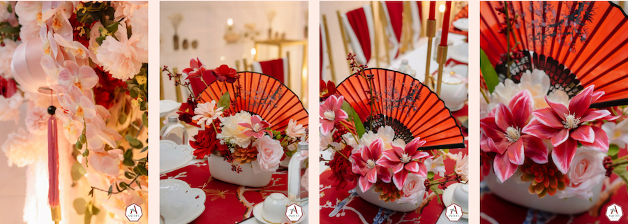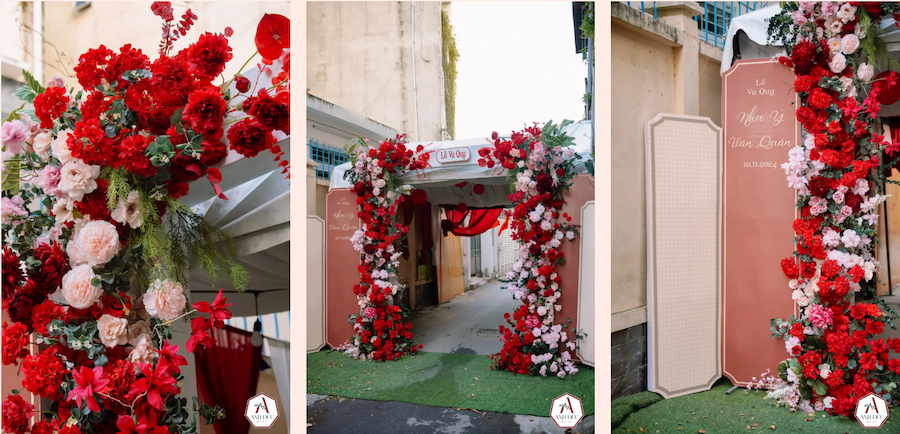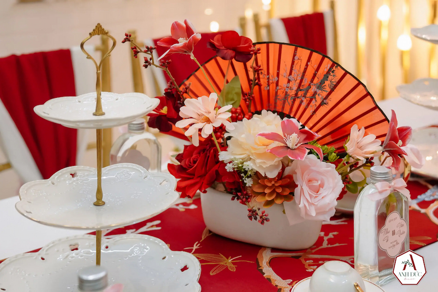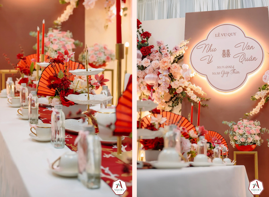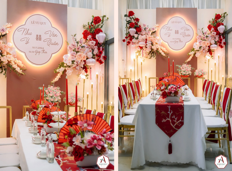 Trong sắc đỏ nâu ấm áp, ánh sáng lồng đèn lung linh thắp sáng không gian, từng chi tiết đều mang ý nghĩa đặc biệt, tượng trưng cho tình yêu, sự gắn kết và những lời chúc phúc trọn vẹn.