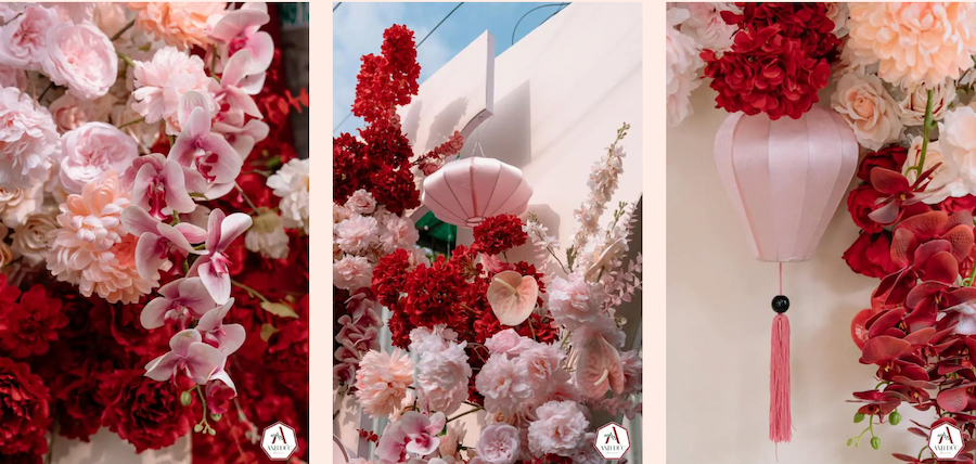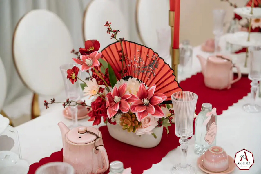 Không phải là sắc trắng hay màu pastel nhẹ nhàng, dâu rể chọn sắc đỏ hồng – rực rỡ, nổi bật, và cũng là màu sắc của tình yêu mà cặp đôi dành cho nhau.