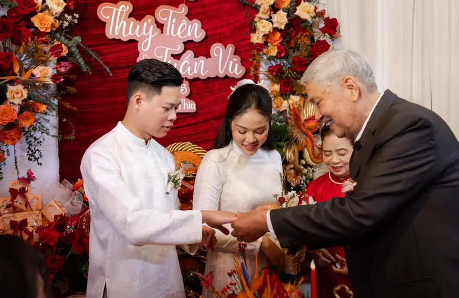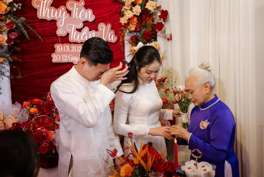 𝐋𝐞̂̃ 𝐠𝐢𝐚 𝐭𝐢𝐞̂𝐧 – khoảnh khắc thiêng liêng nhất trong hành trình về chung một nhà. Chọn sắc đỏ cam ấm áp, rực rỡ như tượng trưng cho sự viên mãn, hạnh phúc tròn đầy và lòng biết ơn sâu sắc với ông bà, cha mẹ.