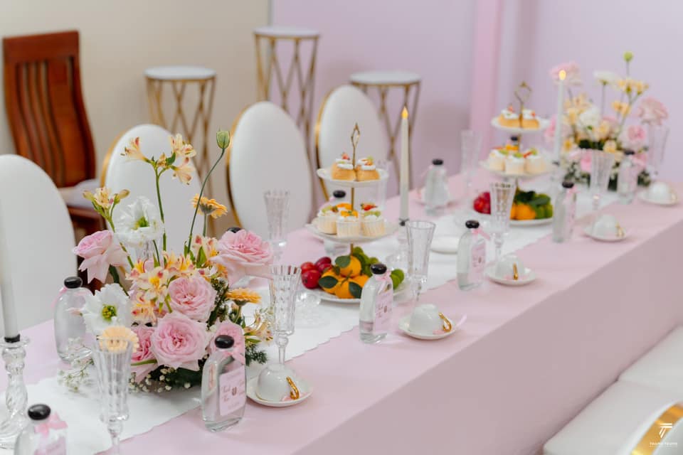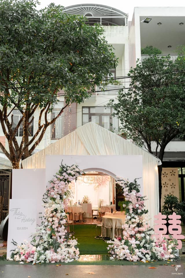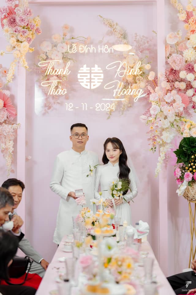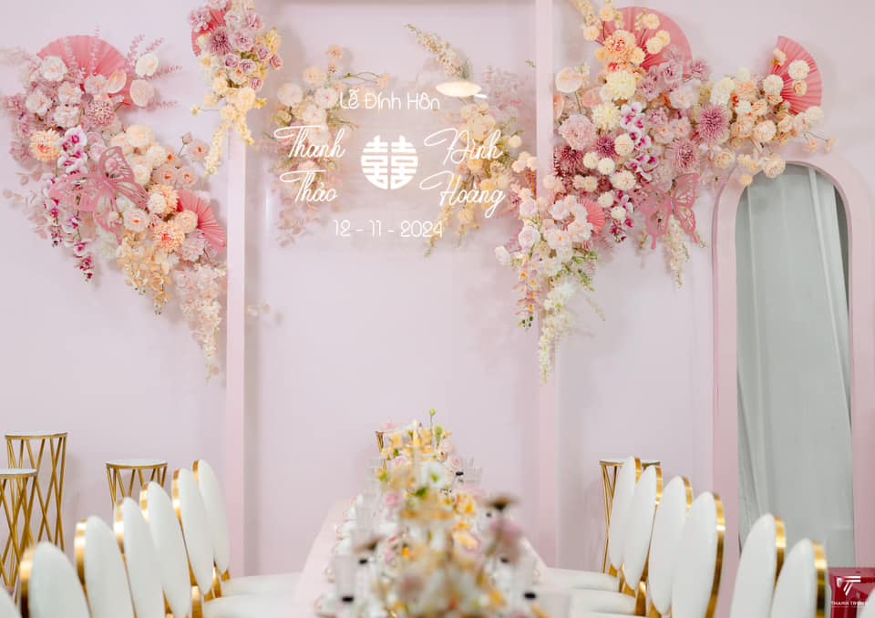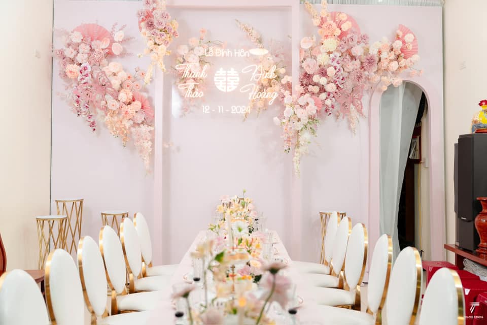 Mẫu trang trí được thiết kế theo sở thích của cô dâu Thanh Thảo , và được làm phần thô chính xác theo kích thước của nhà , tạo nên sự đồng nhất với không gian nhà . Tone màu được cô dâu chọn lựa rất kỹ , được in test cẩn thân trước khi thi công . Hoa trang trí được sử dụng là hoa lụa cao cấp , được phối với hoa tươi để bàn lễ hai họ tạo điểm nhấn . Tên được làm bằng đèn neon tại điểm nhấn cho backdrop chính .