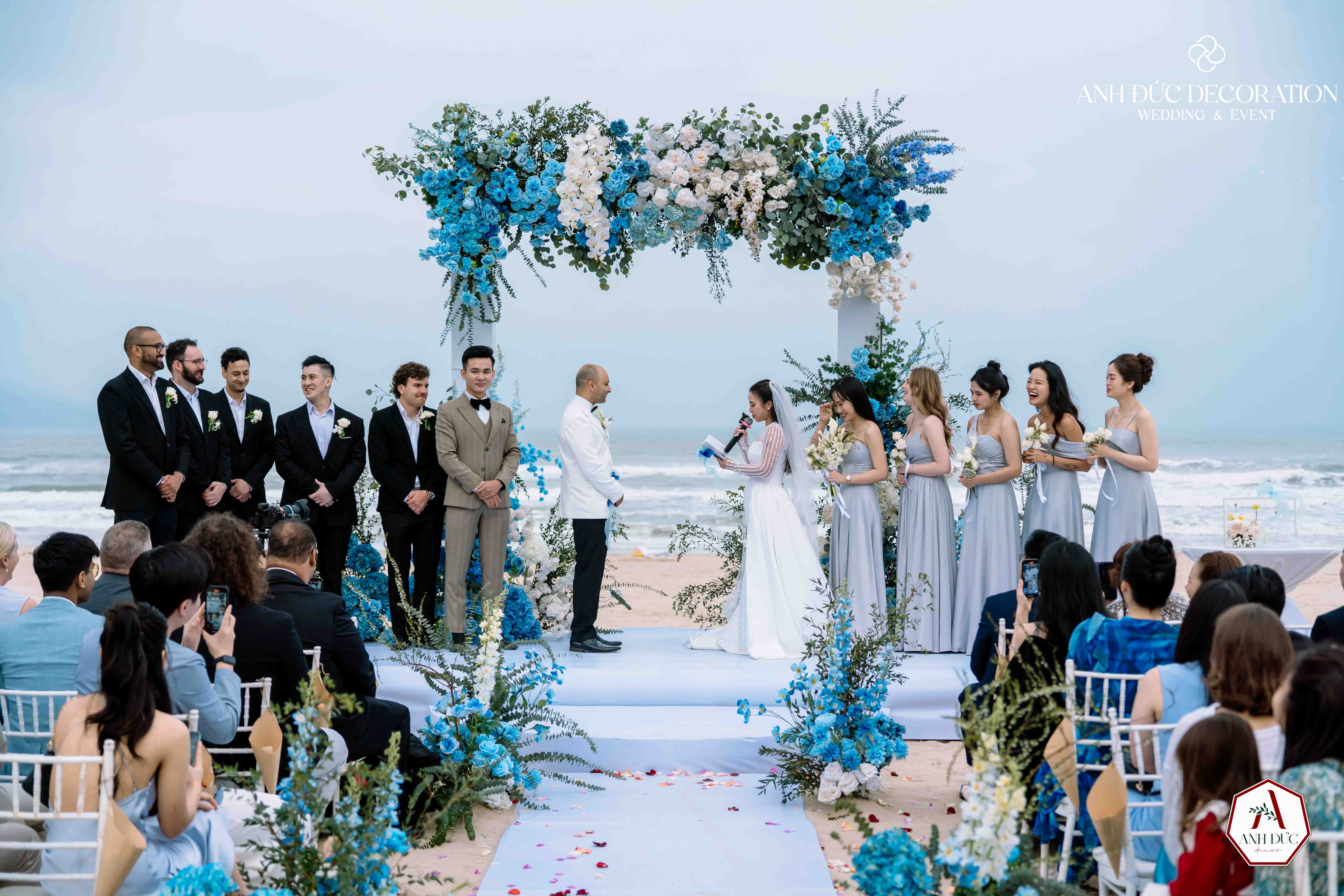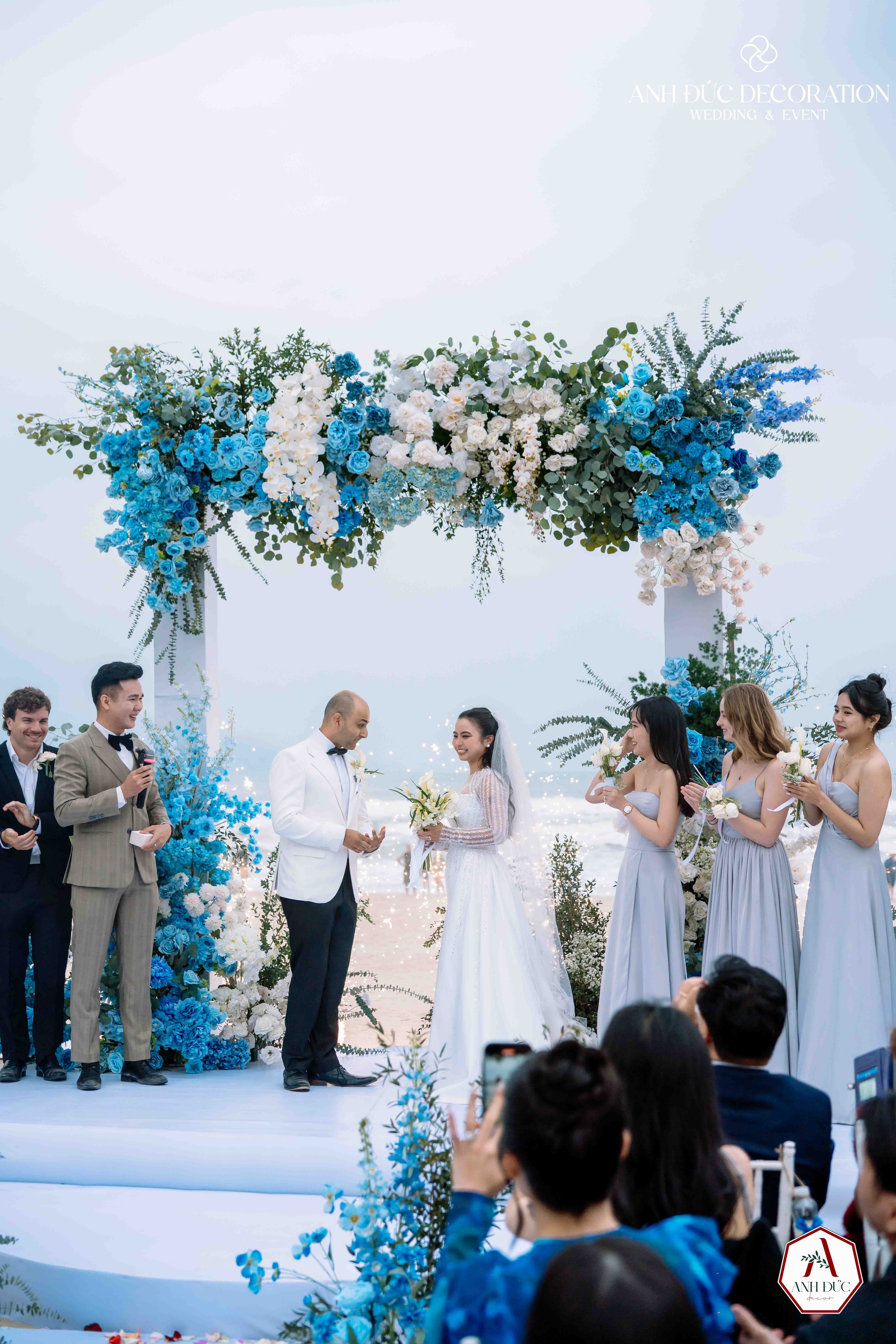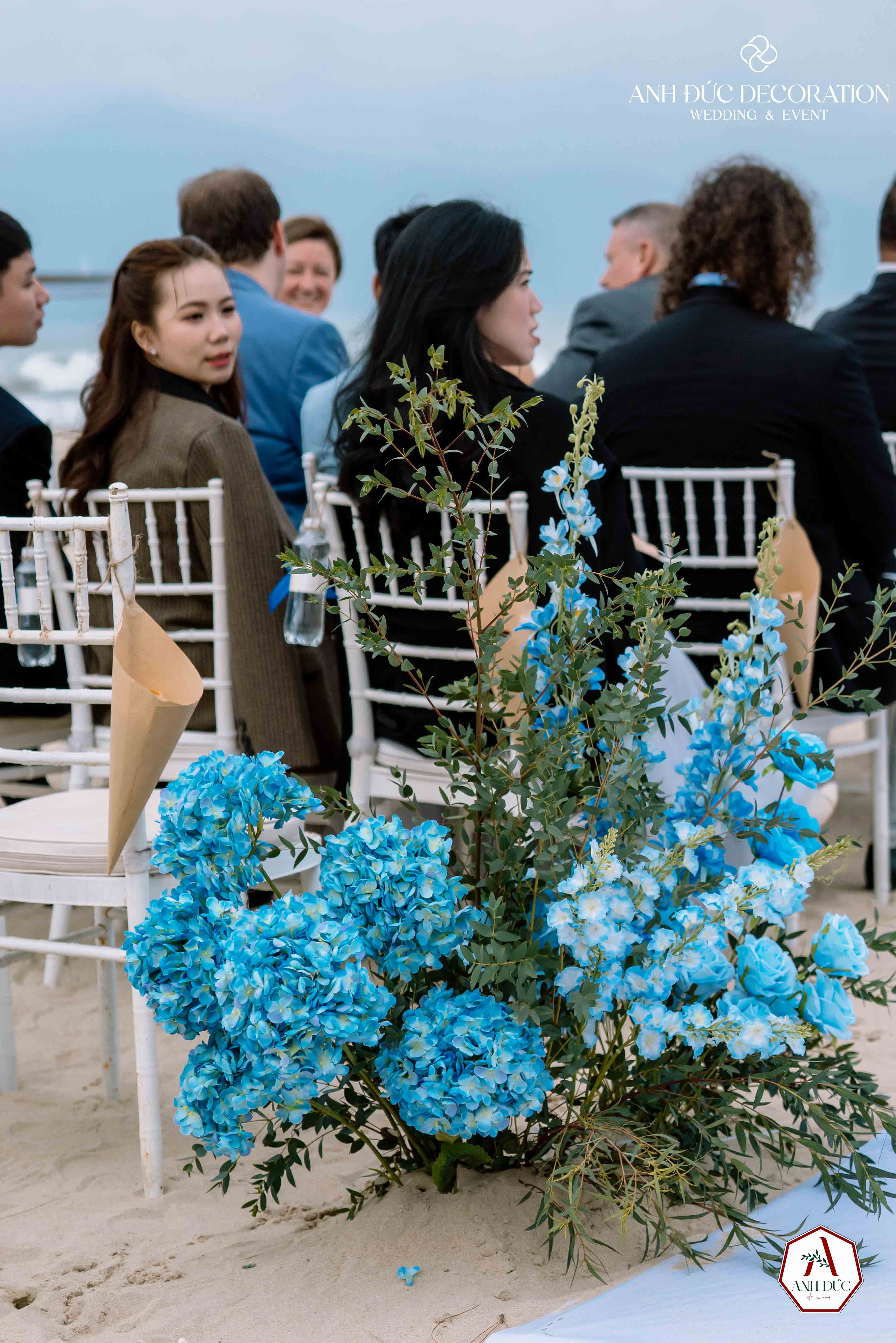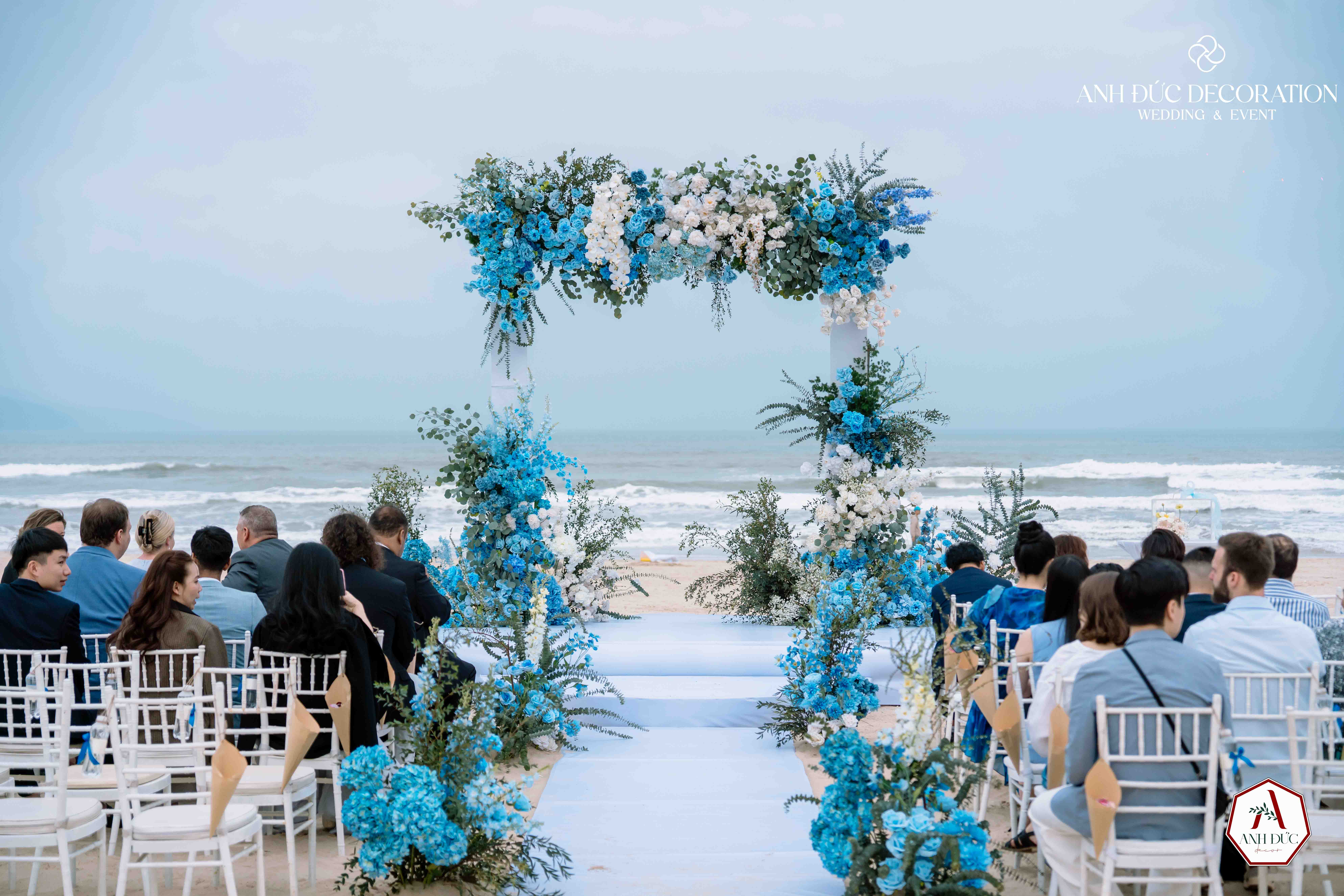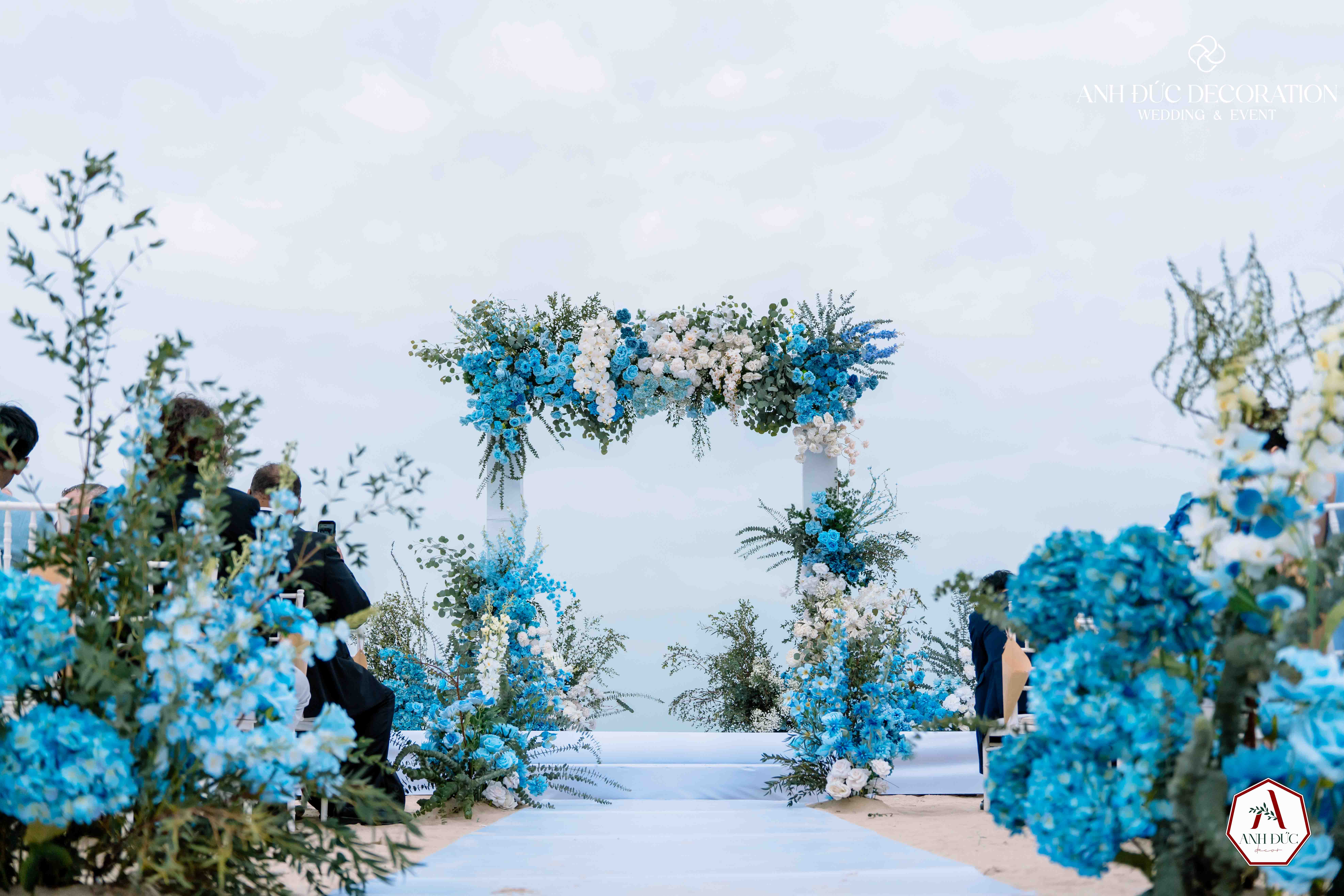Không gian trang trí bởi Anh Đức Decoration được thiết kế tối giản nhưng đầy tinh tế: tông màu xanh đại dương kết hợp trắng tinh khôi, hòa cùng thiên nhiên biển cả. Lối đi trải vải trắng dẫn đến lễ đường, hai bên là những cụm hoa xanh nổi bật, tạo nên khung cảnh vừa hiện đại vừa lãng mạn.