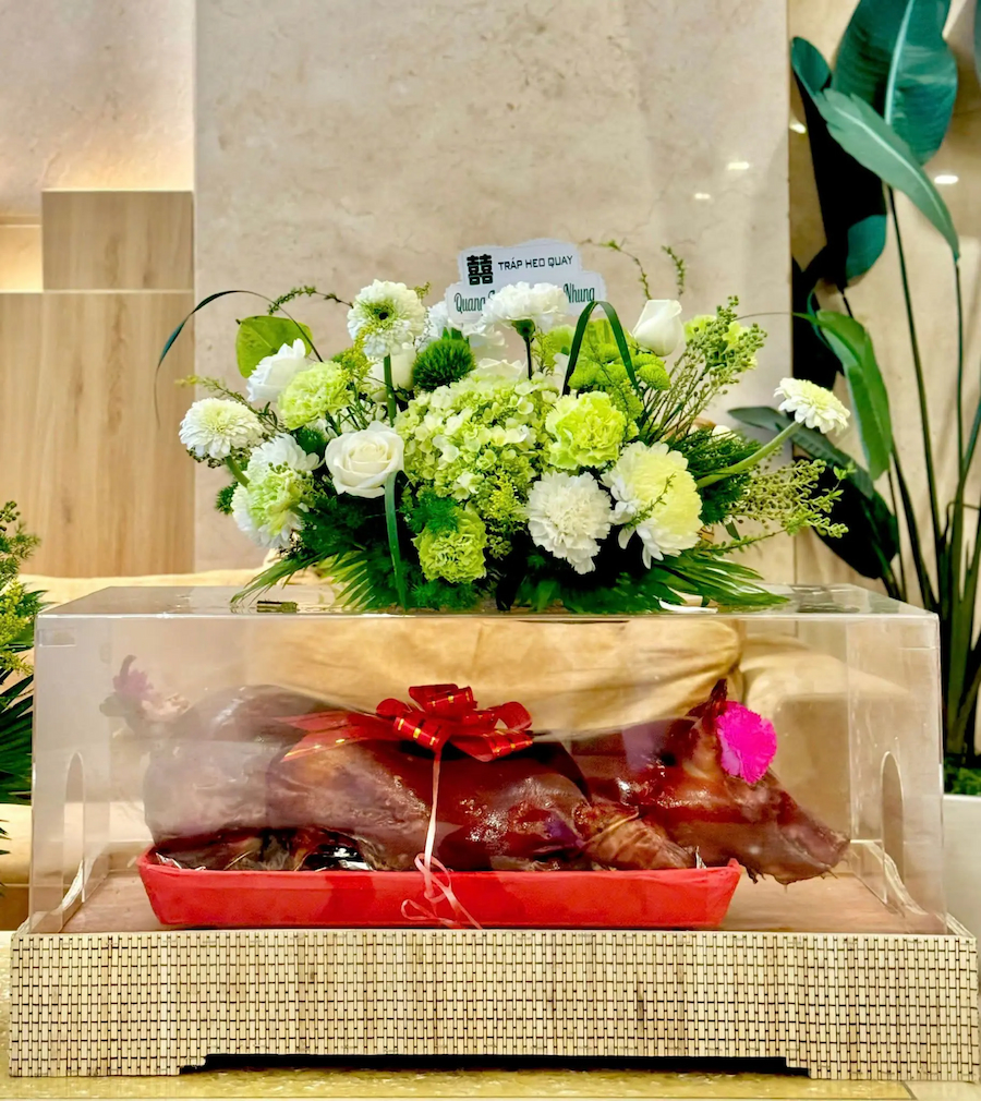 Heo quay là biểu tượng cho sự giàu sang, thịnh vượng và đủ đầy. Mâm heo quay hiện đại thường được bày biện với các chi tiết hoa văn tinh tế, làm nổi bật sự trang trọng của buổi lễ.