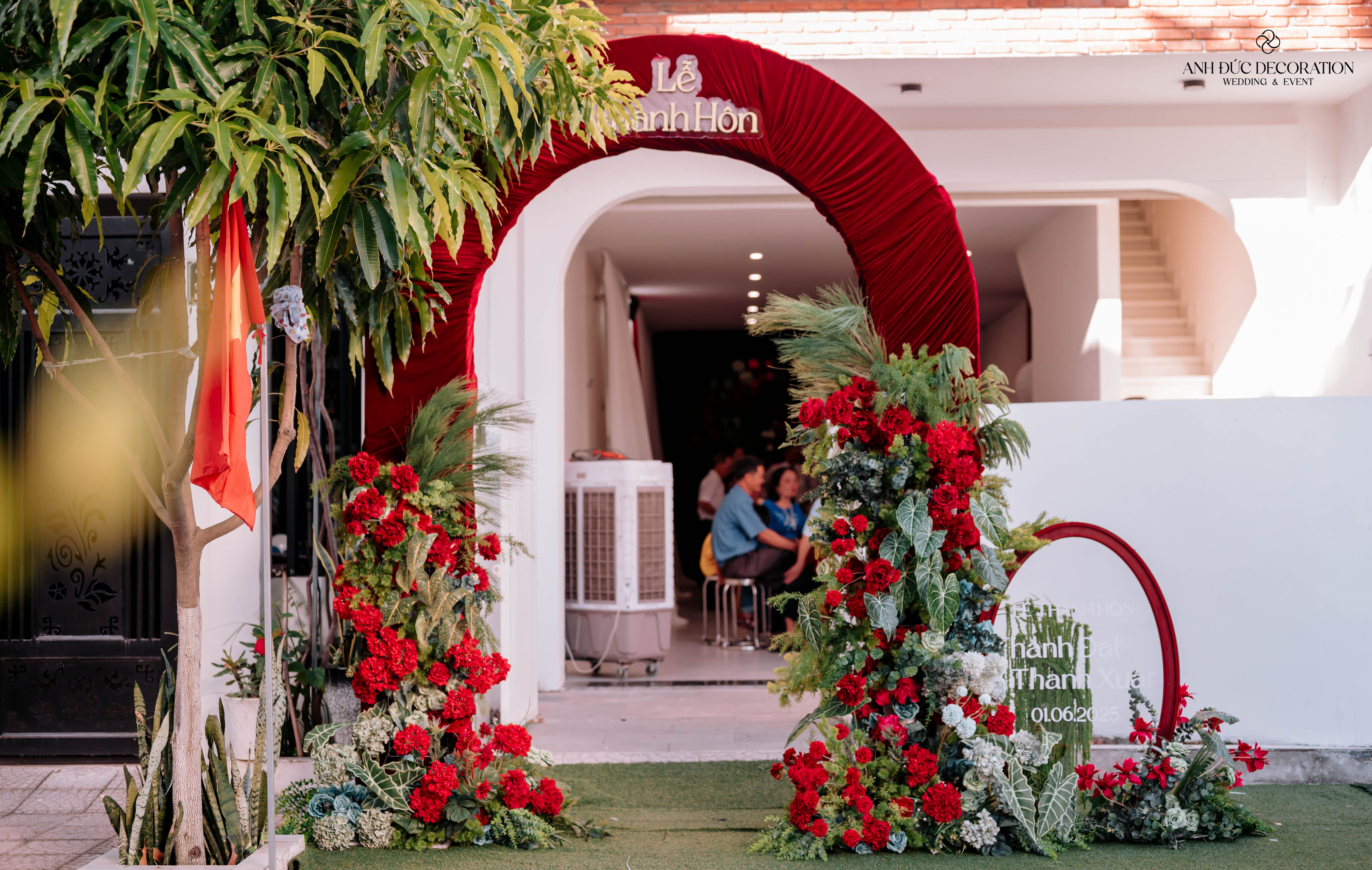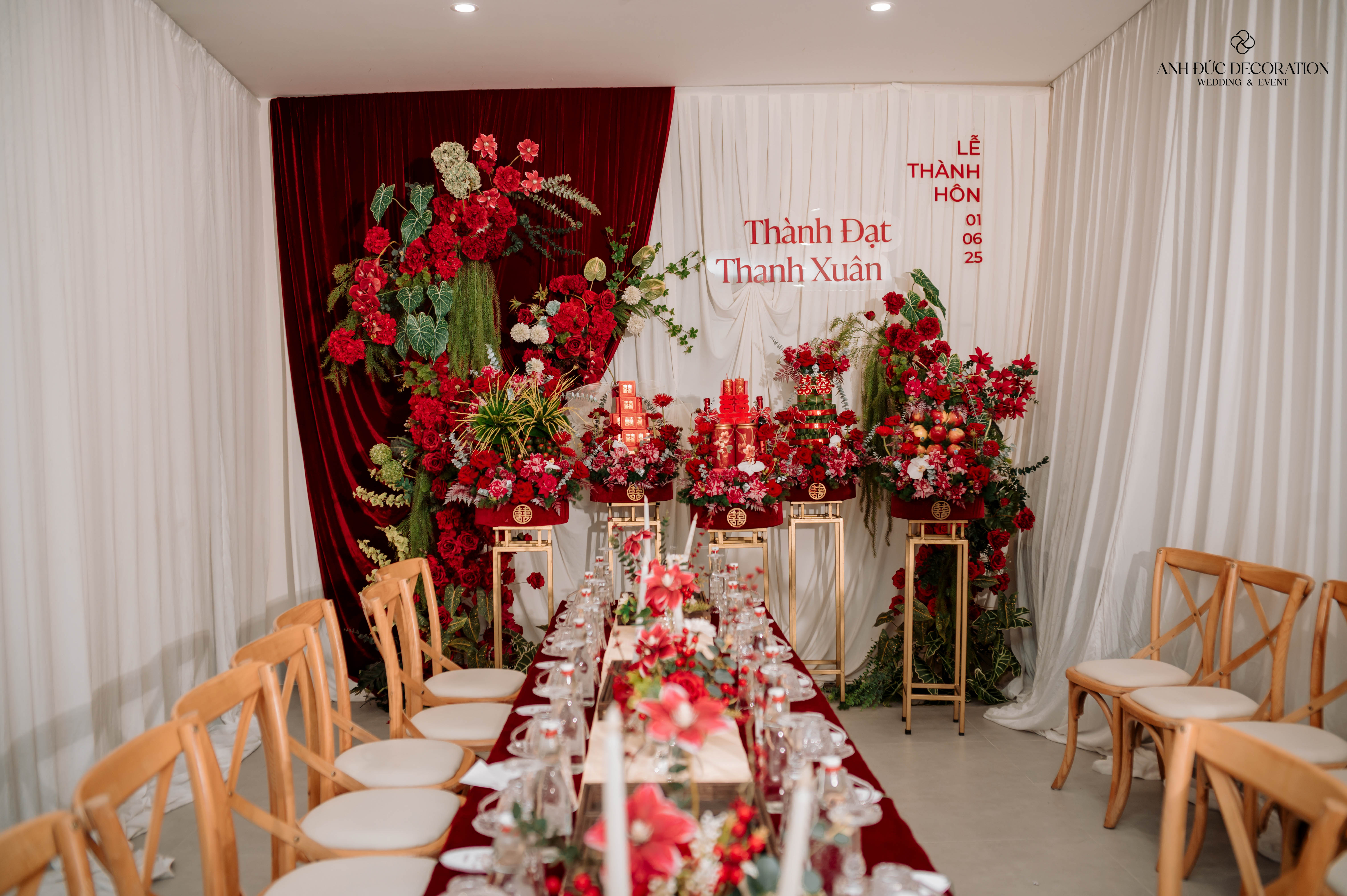 ✨ Trong không gian ấm cúng của ngôi nhà thân thuộc, sắc đỏ nhung sang trọng kết hợp hoa tươi đỏ – trắng – xanh lá đã tạo nên một không gian thành hôn vừa truyền thống, vừa hiện đại – đúng như mong muốn của cặp đôi Thành Đạt & Thanh Xuân.