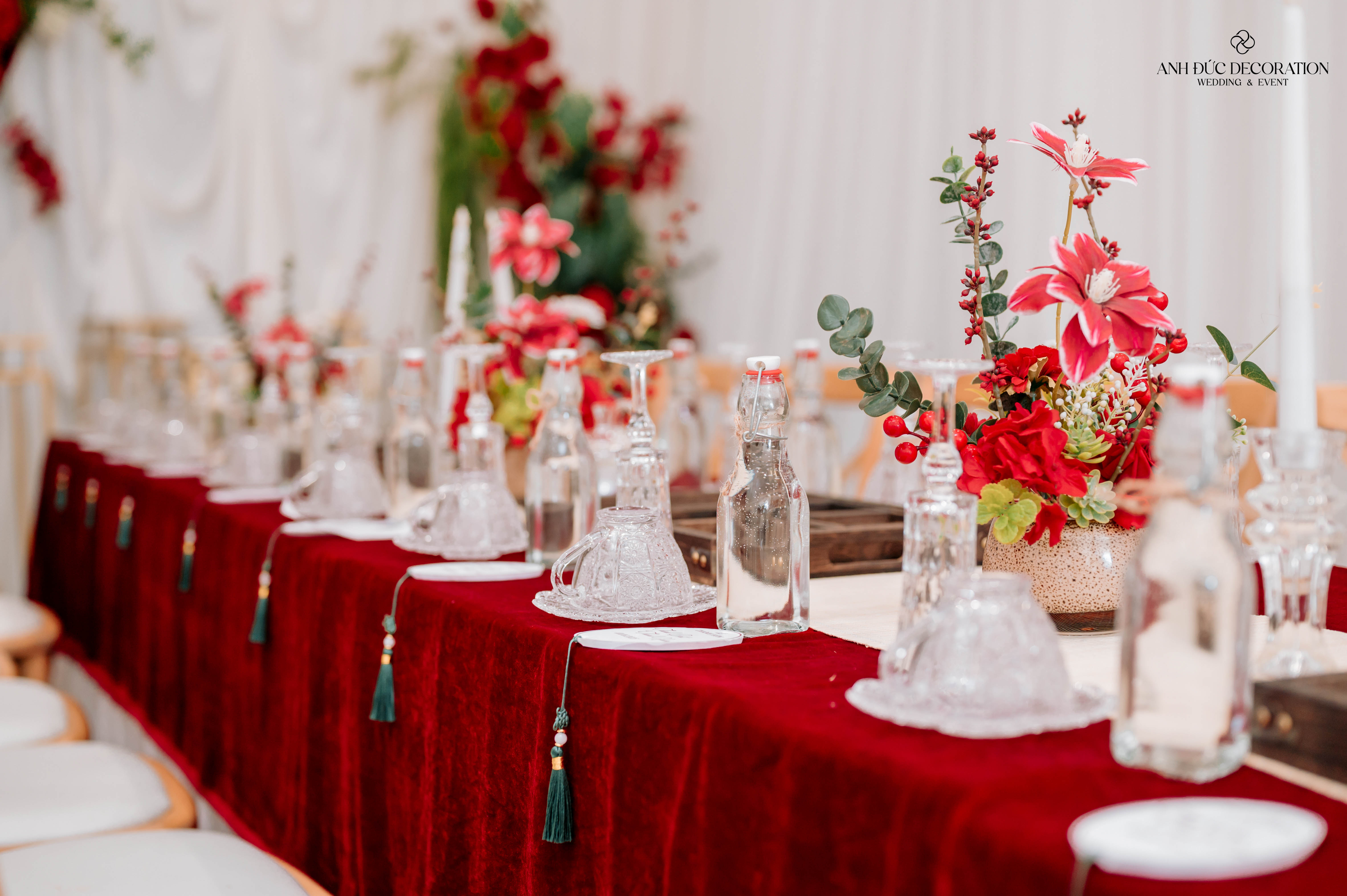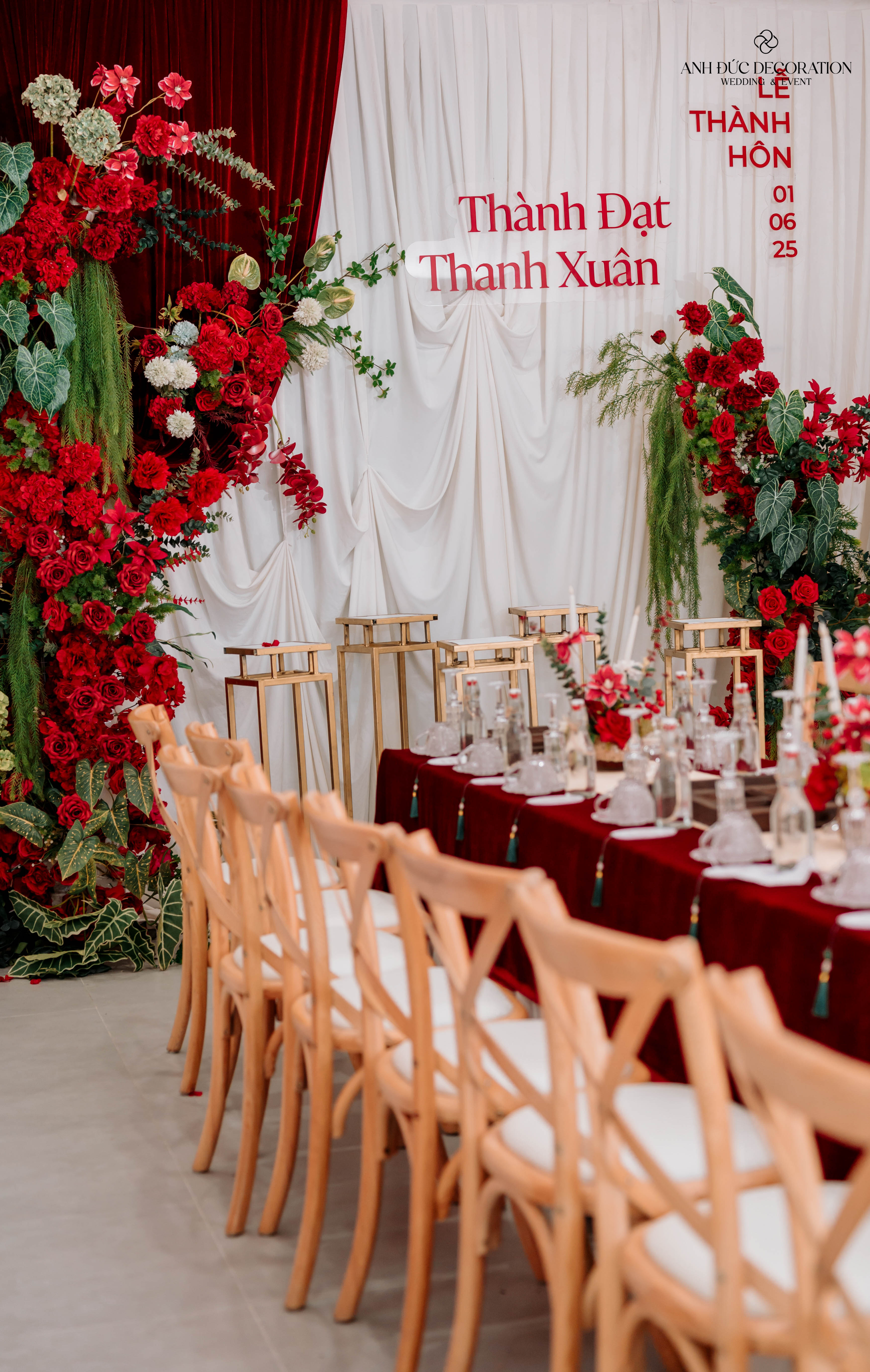Backdrop bàn gia tiên là sự kết hợp hài hòa giữa vải nhung đỏ – vải trắng – cụm hoa tươi rực rỡ và tên cô dâu chú rể nổi bật, mang lại chiều sâu cảm xúc và vẻ đẹp trang trọng cho buổi lễ.