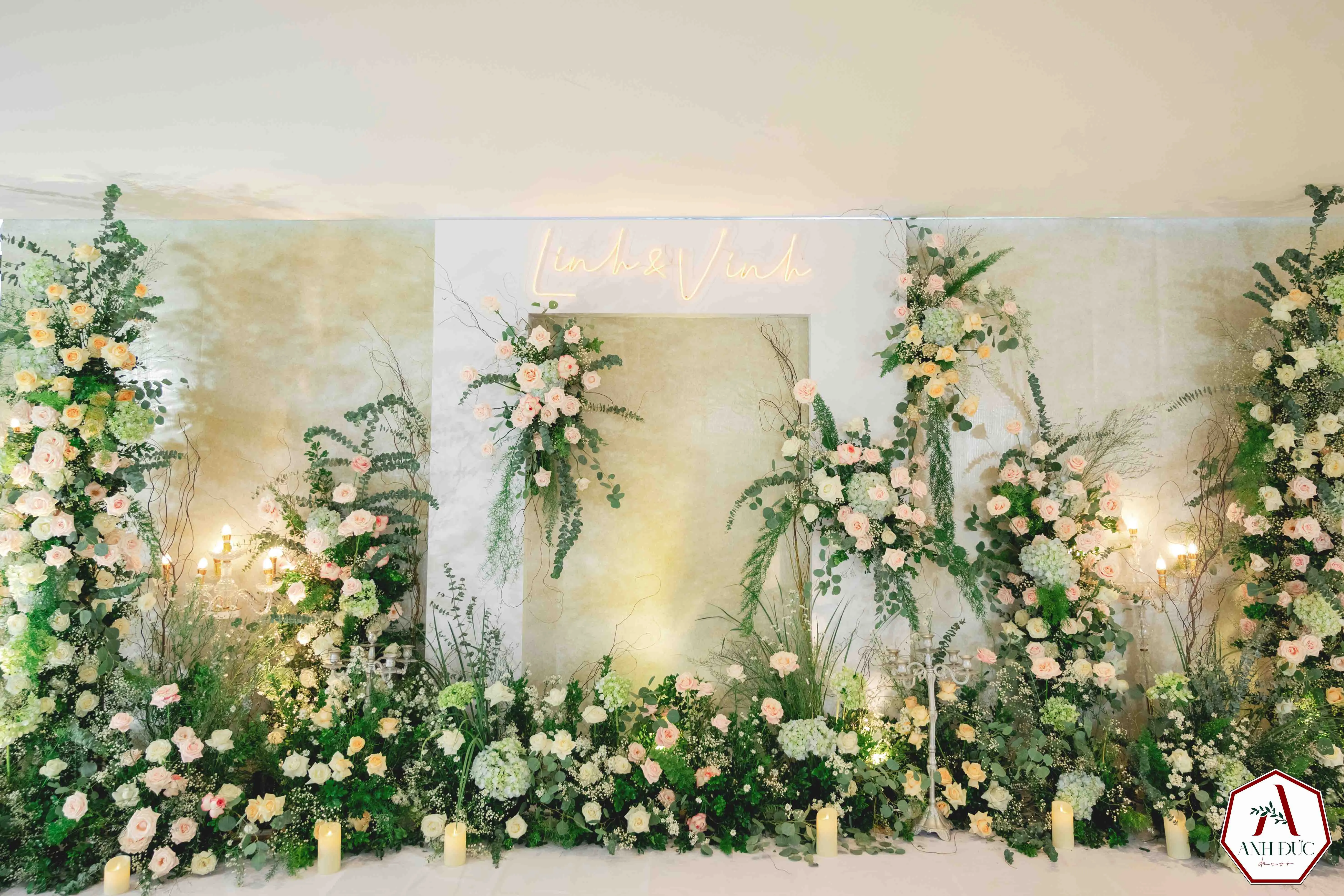 Backdrop hoa tươi sang trọng: Tone màu trắng – xanh – hồng pastel, kết hợp hoa hồng nhập khẩu, baby trắng và lá xanh mát, tạo nên không gian lãng mạn, tinh tế.