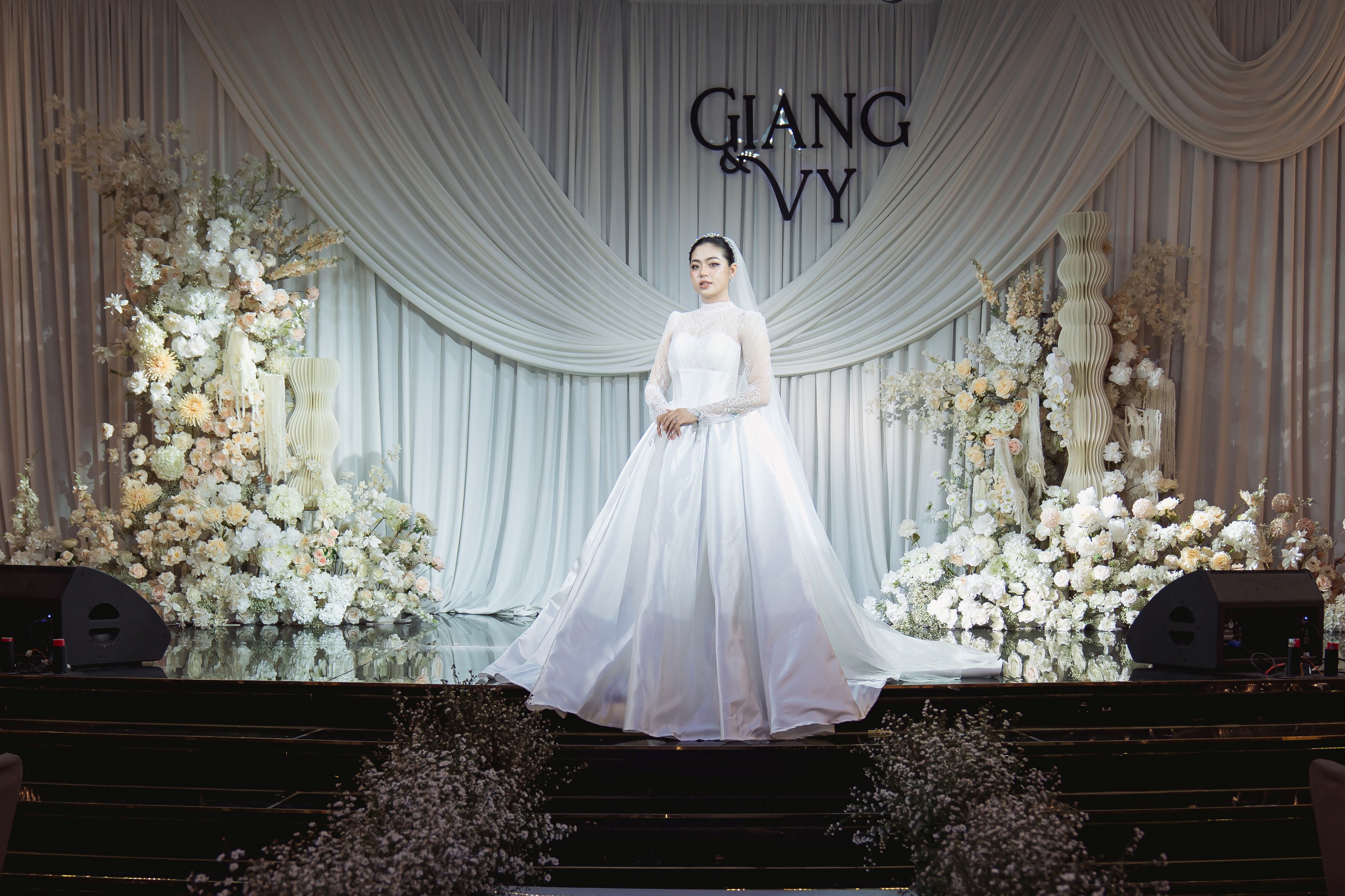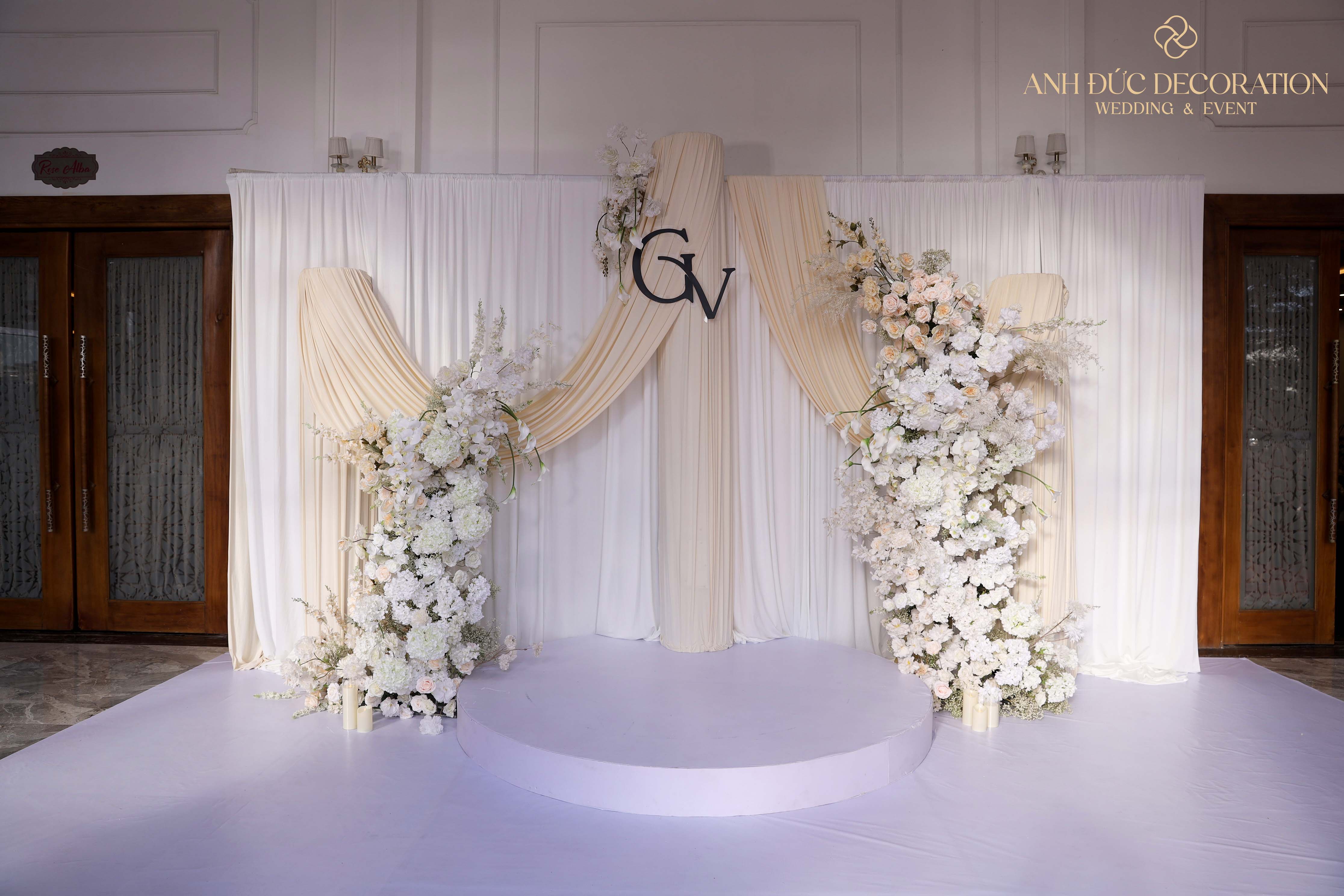Sân khấu tiệc: Thiết kế với phông nền vải trắng kết hợp hoa lụa cao cấp, tạo nên sự cân đối, tinh tế và sang trọng cho không gian tiệc.