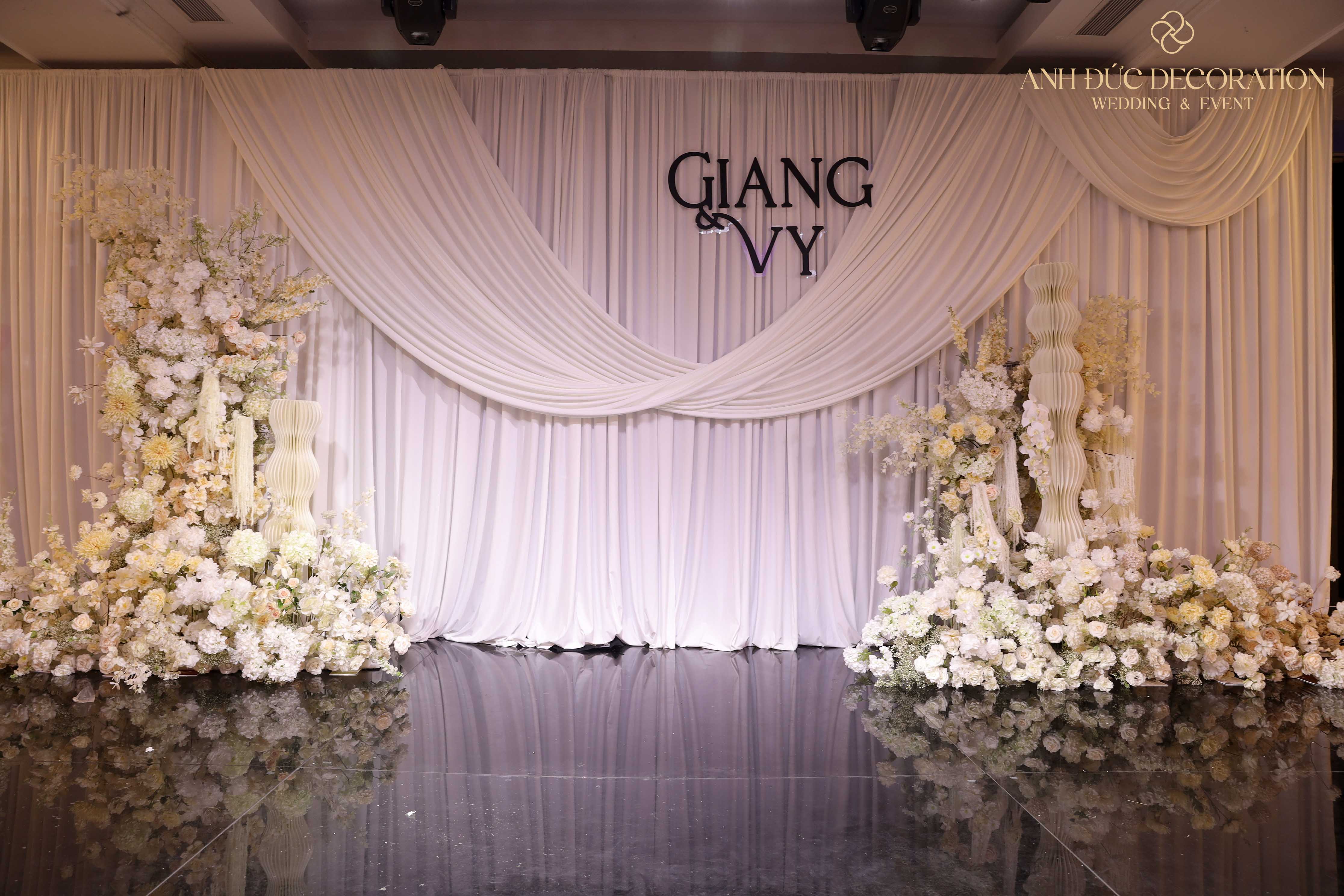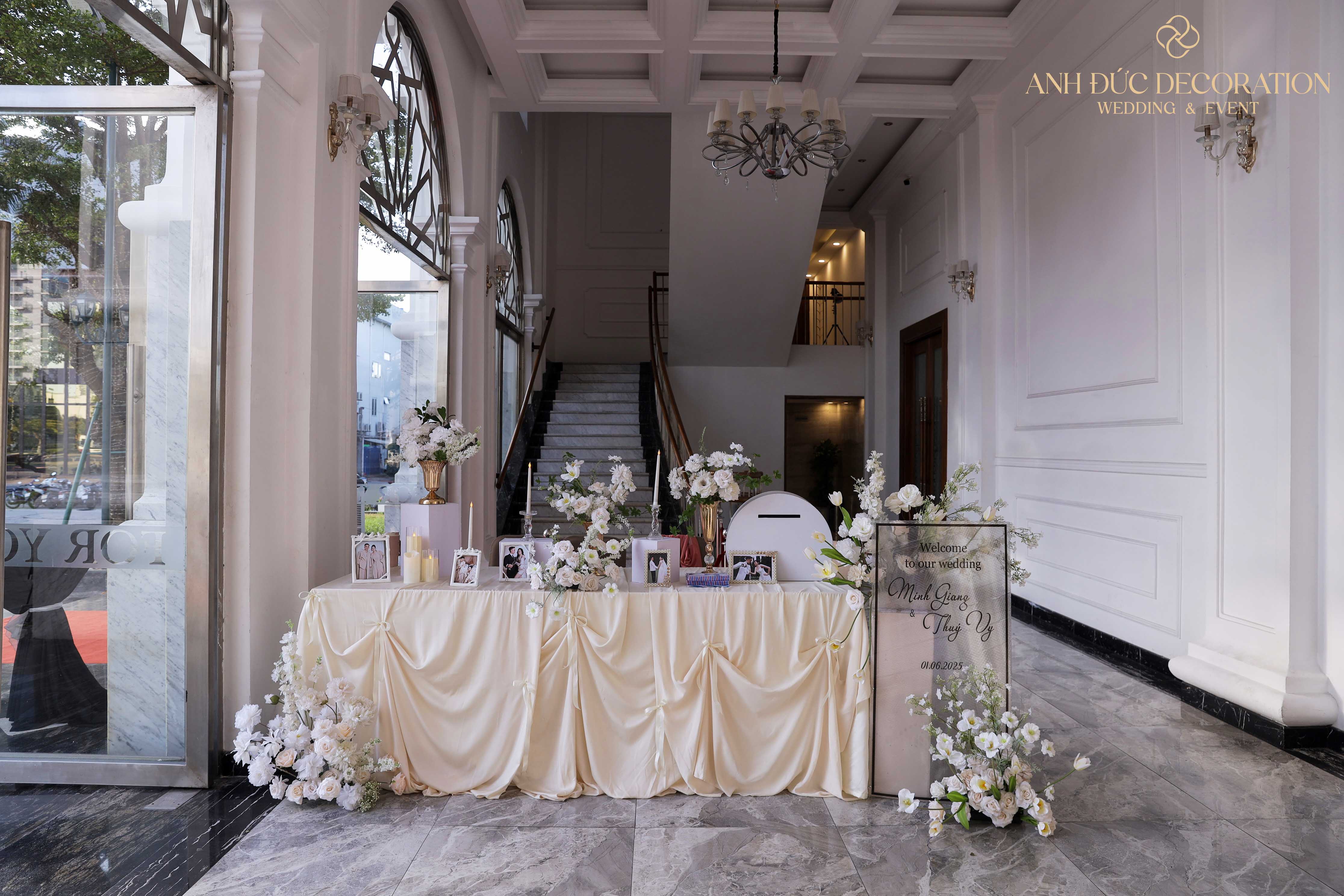 Một không gian cưới mang gam màu trắng – kem chủ đạo luôn là lựa chọn được nhiều cặp đôi yêu thích bởi sự tinh khôi, hiện đại nhưng vẫn vô cùng sang trọng. Bộ decor lần này từ Anh Đức Decoration – Wedding & Event mang đến tổng thể nhẹ nhàng, thanh lịch và đầy tính nghệ thuật.