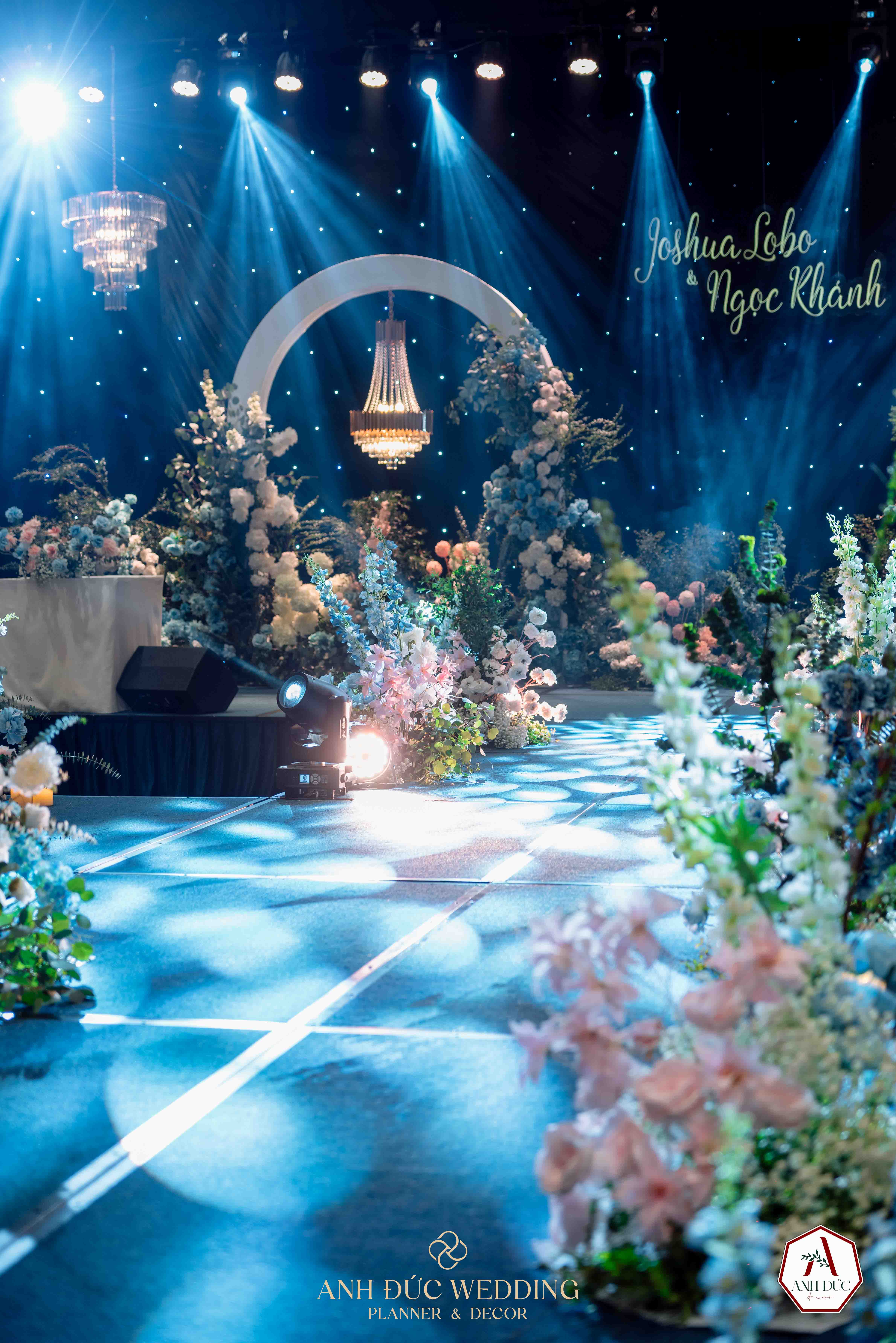 Sân khấu chính: phủ đầy hoa tươi và hoa cao cấp nhập khẩu với tông màu xanh dương, trắng và hồng pastel. Lớp sương khói nhẹ nhàng trải dài tạo hiệu ứng mơ màng, lãng mạn.